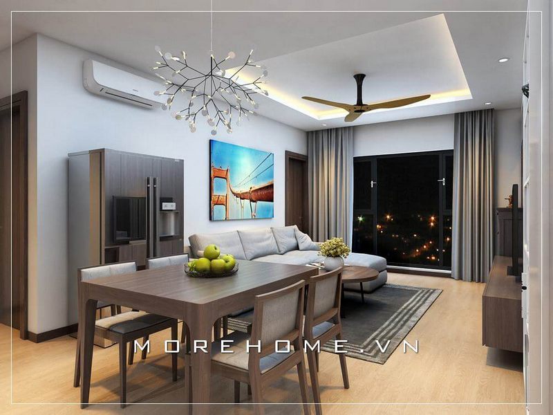 Không gian phòng khách được thiết kế liền phòng ăn phong cách hiện đại tạo nên sự tiện nghi và tiết kiệm được diện tích vui chơi, trang trí cho nhà chung cư