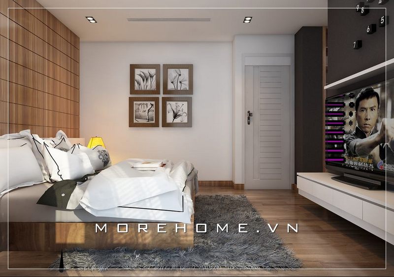 Phòng ngủ là nơi cần nhiều yếu tố tự nhiên và thoải mái nhất nên vậy KTS đã lựa chọn sàn gỗ hài hòa lại không gian phòng
