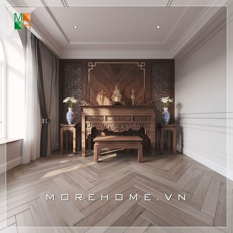 Thiết kế nội thất phòng thờ từ gỗ óc chó cao cấp, sang trọng thể hiện sự thành tâm của gia chủ.