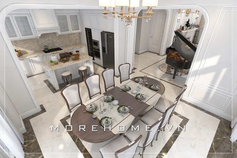 Thiết kế nội thất phòng ăn tân cổ điển liền kề với không gian phòng bếp giúp mang lại những bữa cơm nhanh chóng và ngon miệng hơn