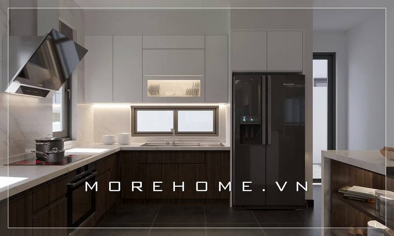 Thiết kế nội thất phòng bếp hiện đại với tone màu nâu trắng mang đến không gian ấn tượng, điểm nhấn cho căn phòng